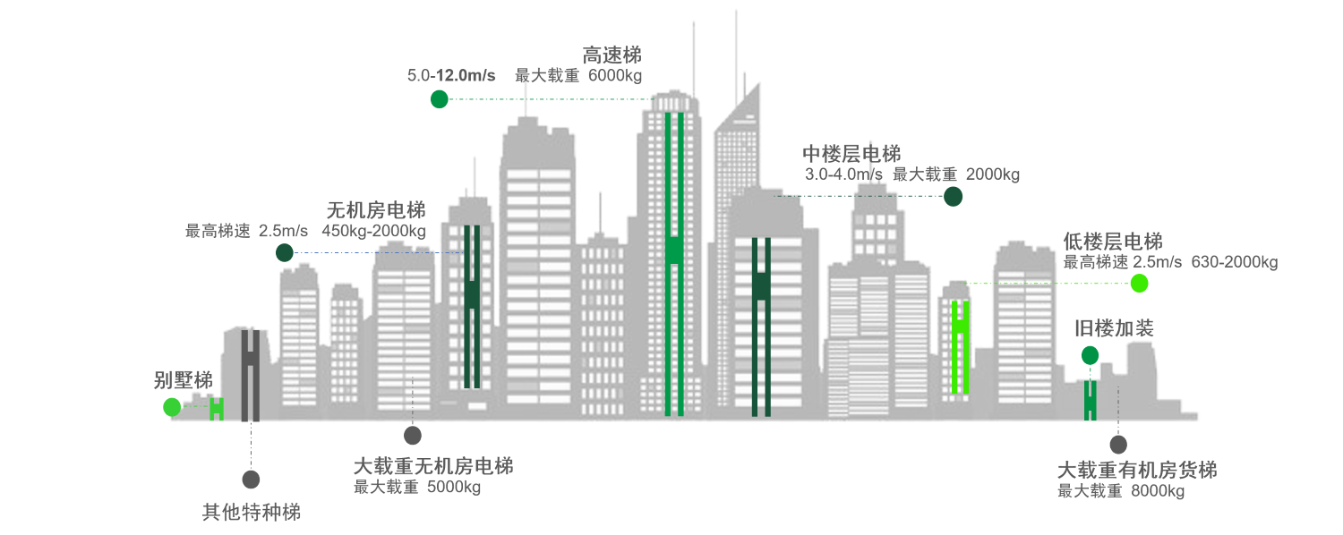 Мо доираи васеи мошинҳои кашиш ва мейнфреймҳои мувофиқро пешниҳод менамоем, ки барои сенарияҳои барномавӣ бо иқтидори максималии сарбории 6000 кг (таносуби 2:1) ва суръати максималии 12м/с (таносуби 1:1) мувофиқанд. Мизоҷон метавонанд мустақиман моделҳои мувофиқро дар асоси параметрҳои лифт интихоб кунанд, ки давраи тарроҳиро ба таври назаррас кӯтоҳ мекунад.